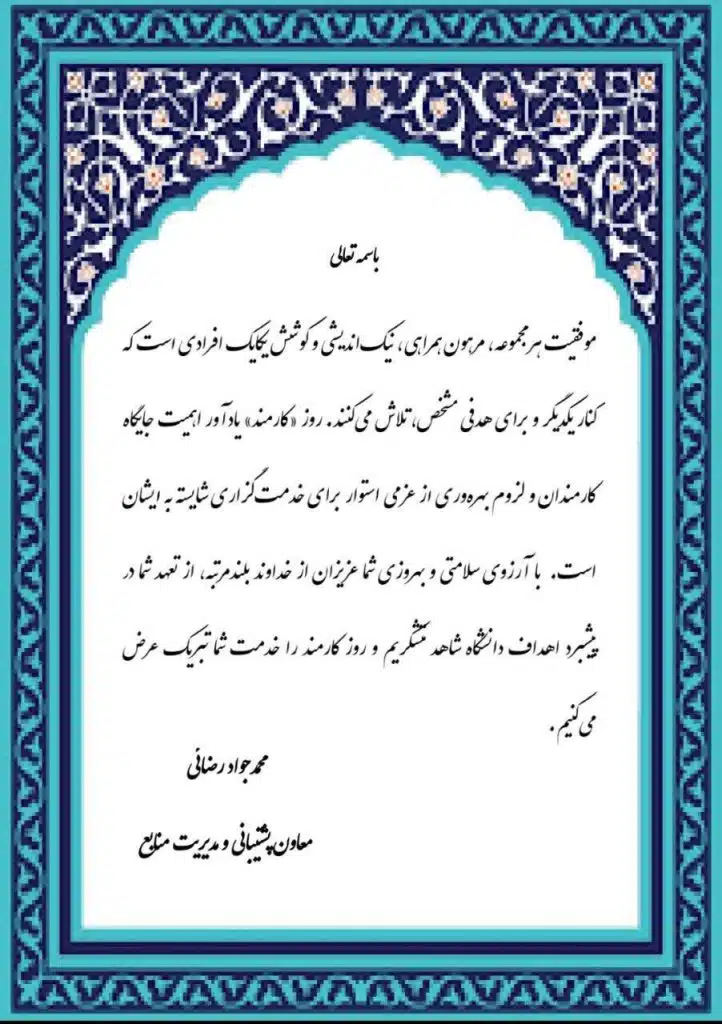 پیام تبریک معاون پشتیبانی و مدیریت منابع به مناسبت روز کارمند